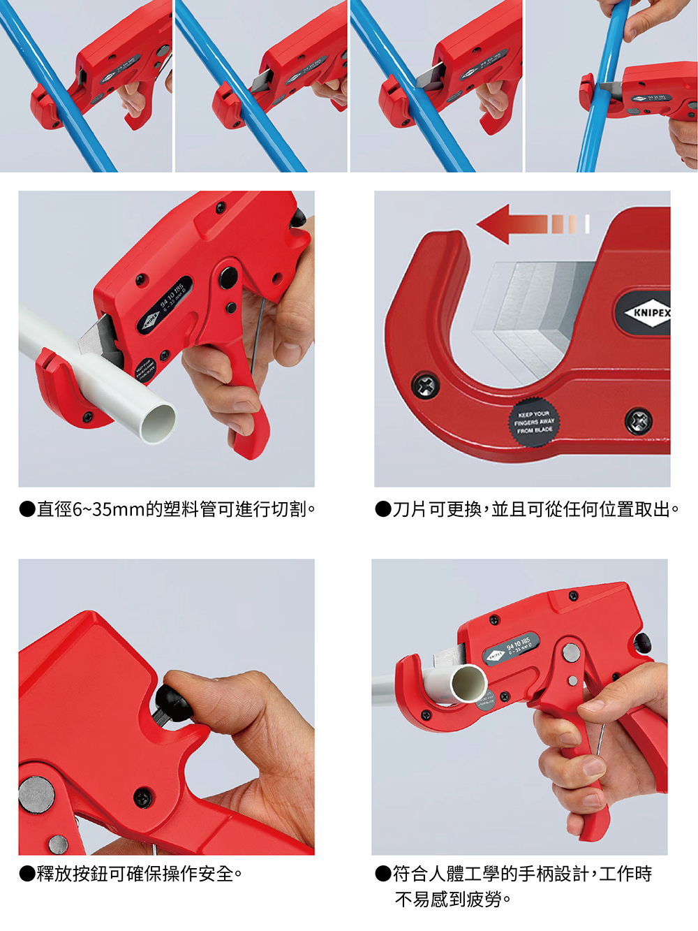 • KNIPEX 塑膠導管管切割器,適合乾淨切割塑膠管。